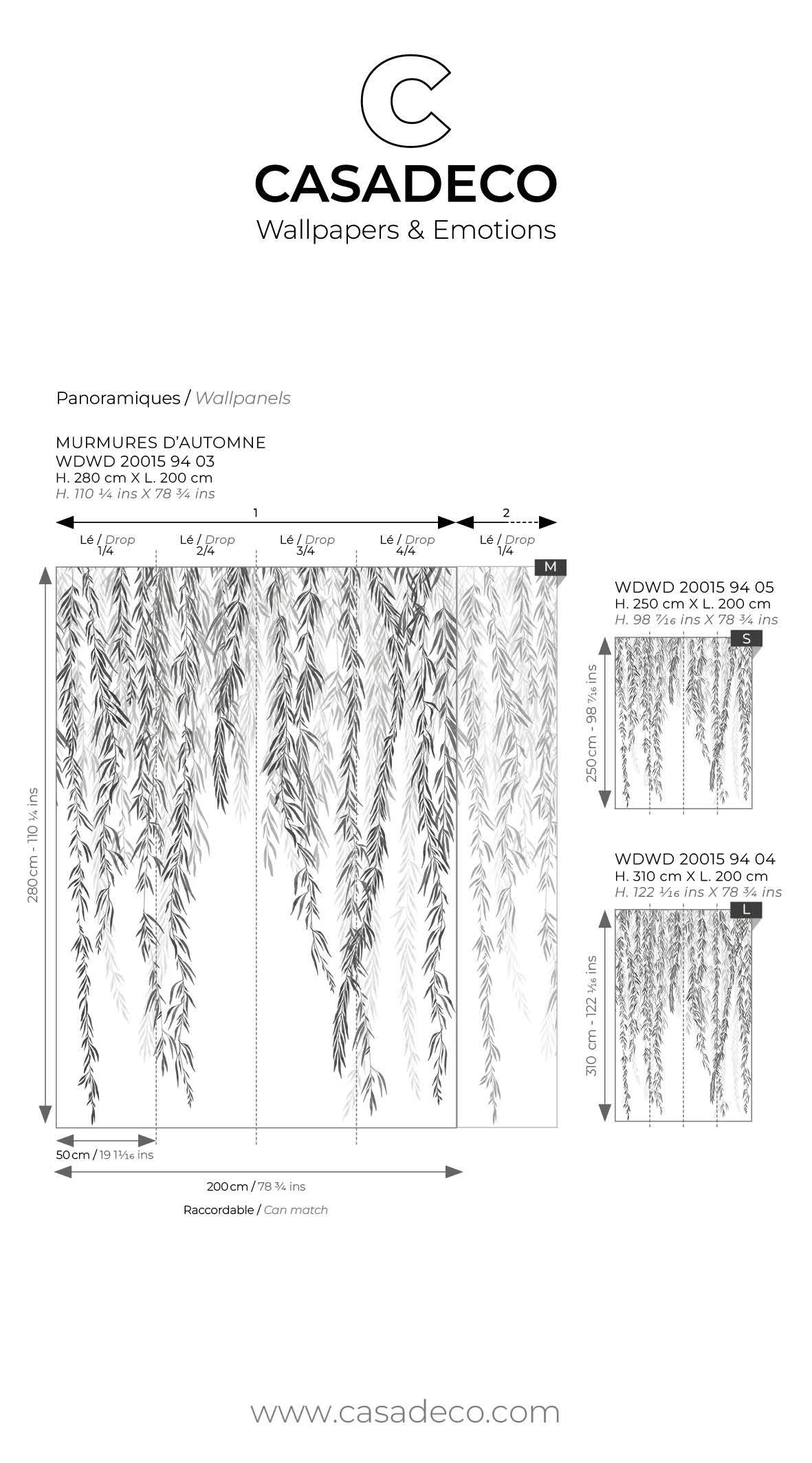 In the shade of trees Have you ever taken shelter under a weeping willow during a shower? Its umbrella of branches is wonderful protection from bad weather or unwanted attention. Come and hide under the trees with Murmures d automne and listen to the leaves softly rustling in the breeze. This panoramic wallpanel comes in three colourways: a green in tribute to plants a delicate black and white engraving and a sepia.